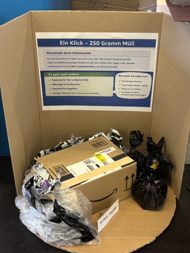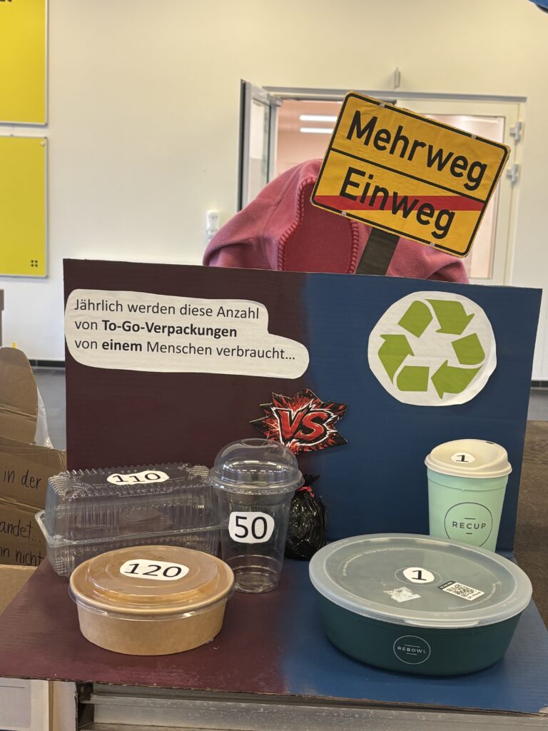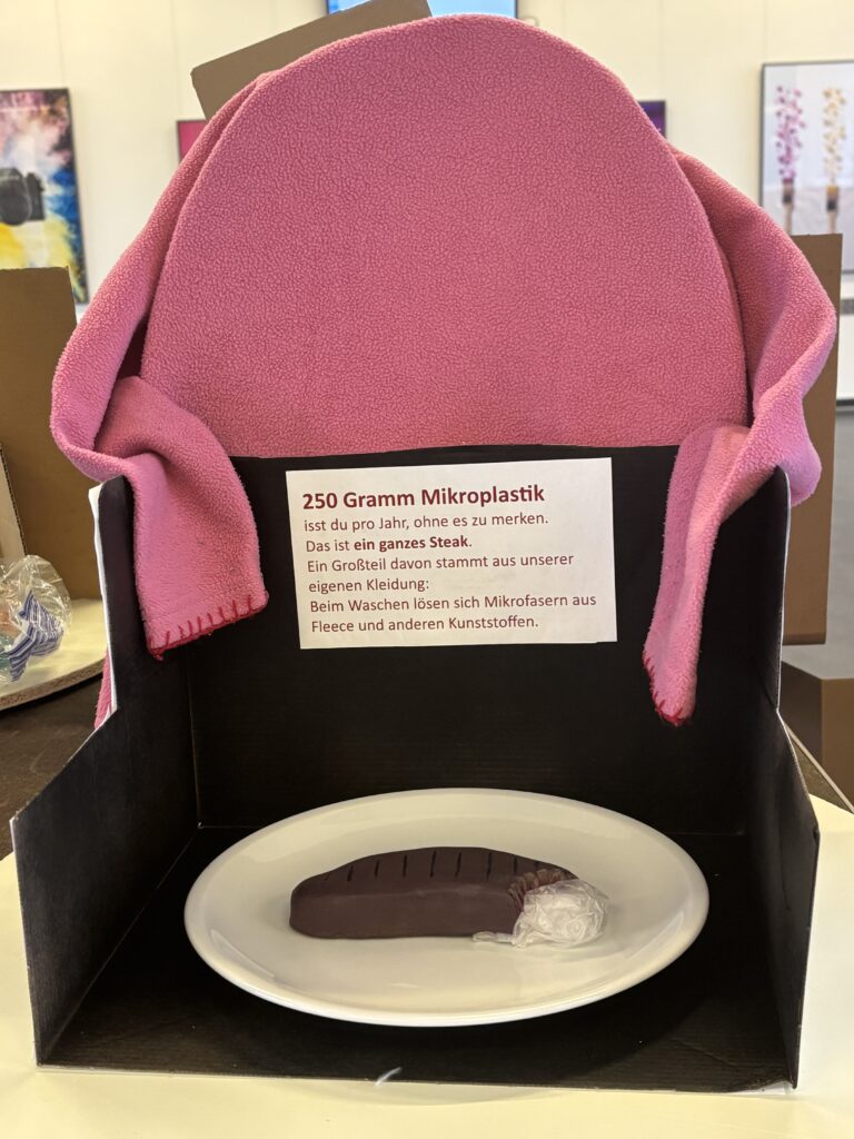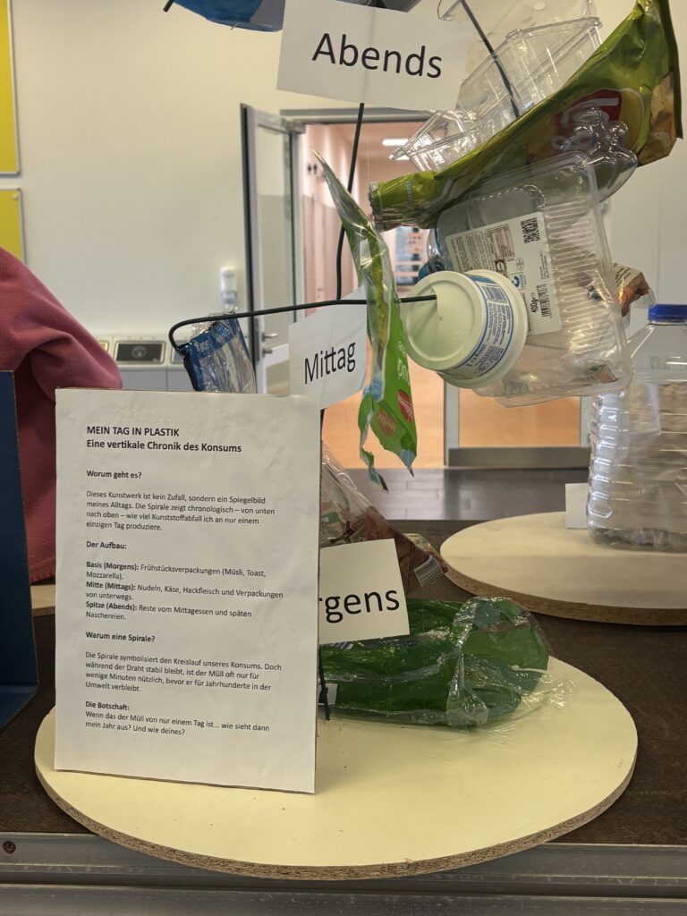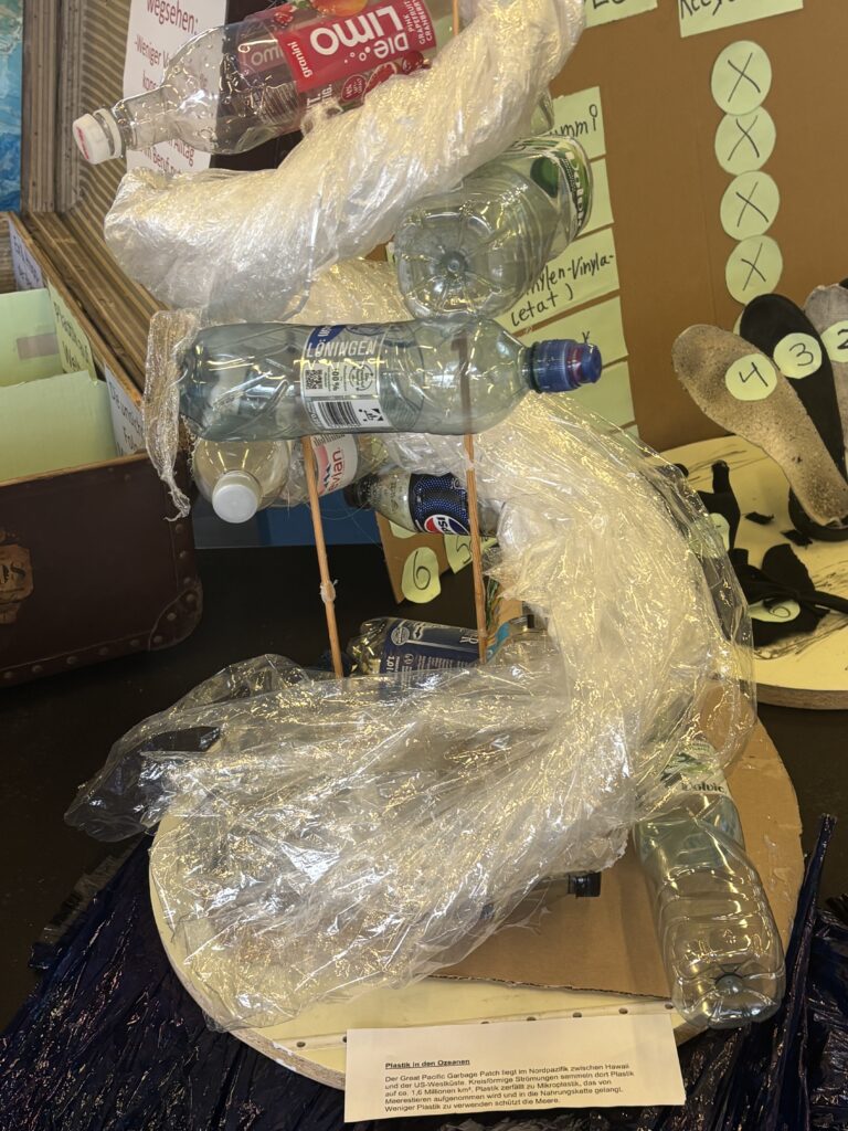 Die Plastikflut soll sichtbar in unsere Schule schwappen und ist nun im Foyer Bauteil 1 zu sehen. Die Schüler:innen haben entlang der vielfältigen Teilthemen Exponate erstellt, die das drängende Problem der aktuellen und steigenden Plastikflut auf den Punkt bringen und auch positive Impulse geben.